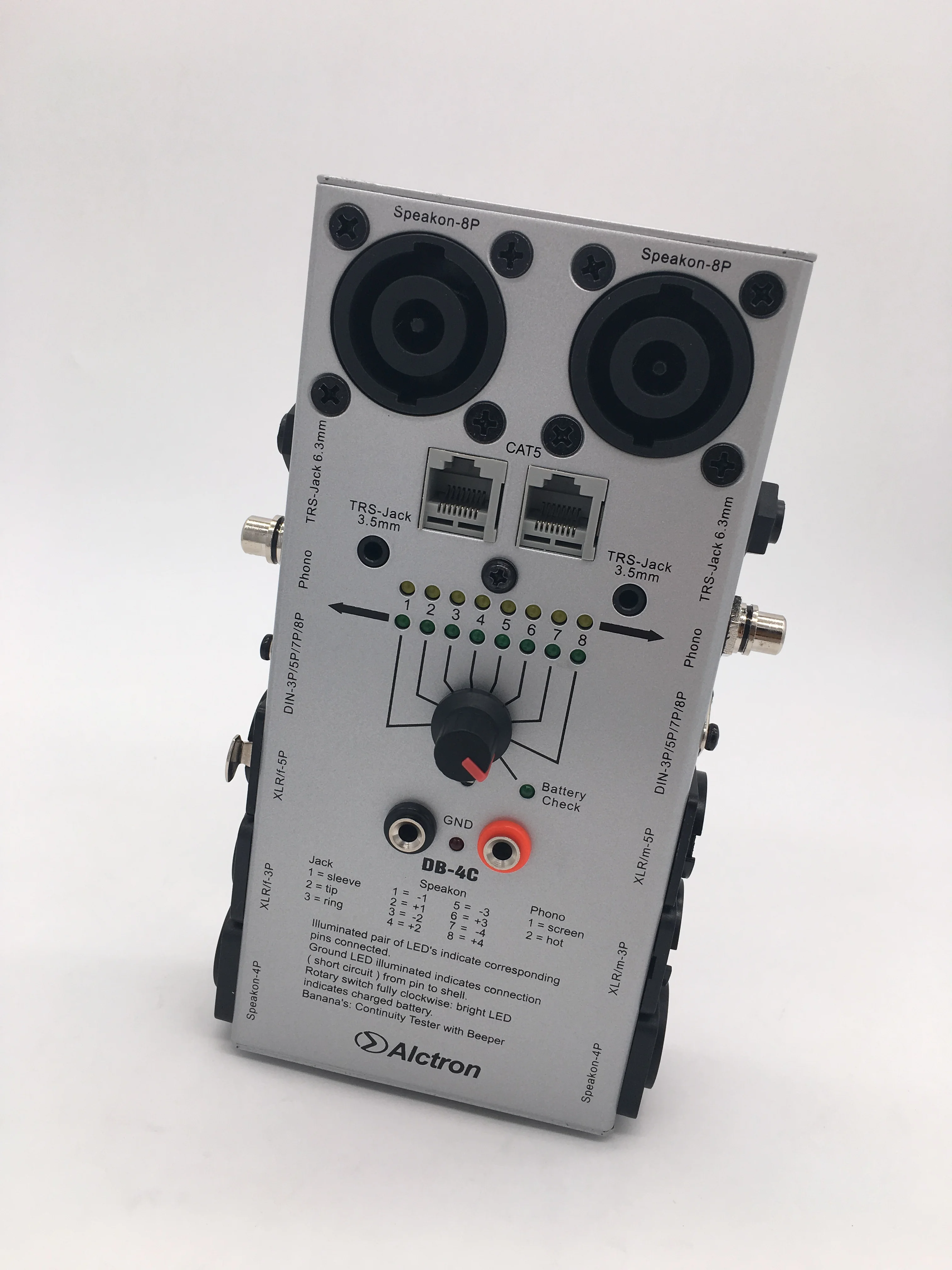 Alctron's DB-4C Cable Tester é um deve ter para qualquer engenheiro de áudio ou músico. Teste todos os seus importantes cabos de microfone XLR, instrumento 1/4 ", linha RCA e coluna com este dispositivo compacto. Pode testar até 8 pinos, incluindo conectores Speakon NL8.