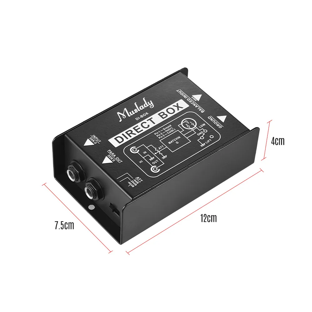 Caixa direta passiva do metal do tamanho compacto, para converter um alto-impedância, o nível de linha e o sinal desequilibrado da saída a um baixo-impedância, o nível do microfone e o sinal de entrada equilibrado.